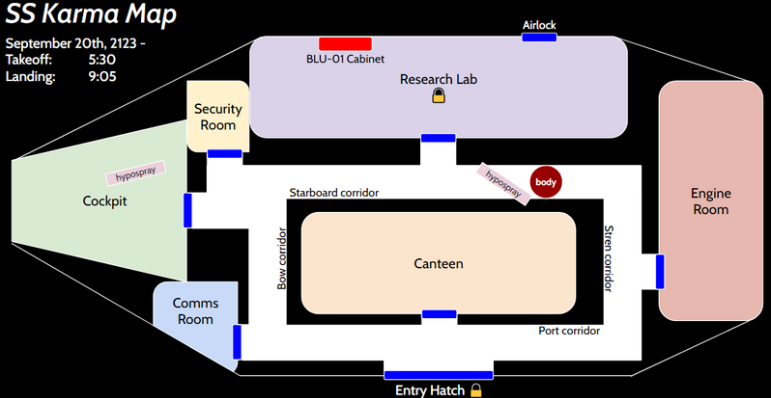 For Worms Against Humanity, I provide the spaceship’s map, autopsy report of the deceased Captain, and a profile of the disease that’s central to the game. This public information is key for solving the mystery.