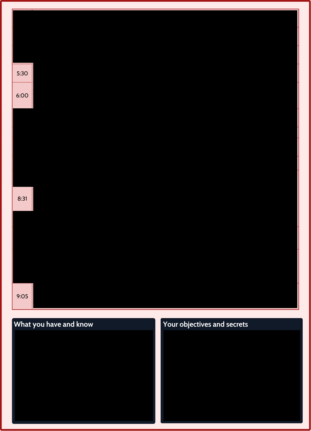 In Worms Against Humanity, there are only two pages to read since it’s a simpler game. I included one page of backstory and historical timeline, and another page dedicated to the timeline of the murder and objectives, secrets, possessions, and knowledge. See the redacted version for “Red” below: